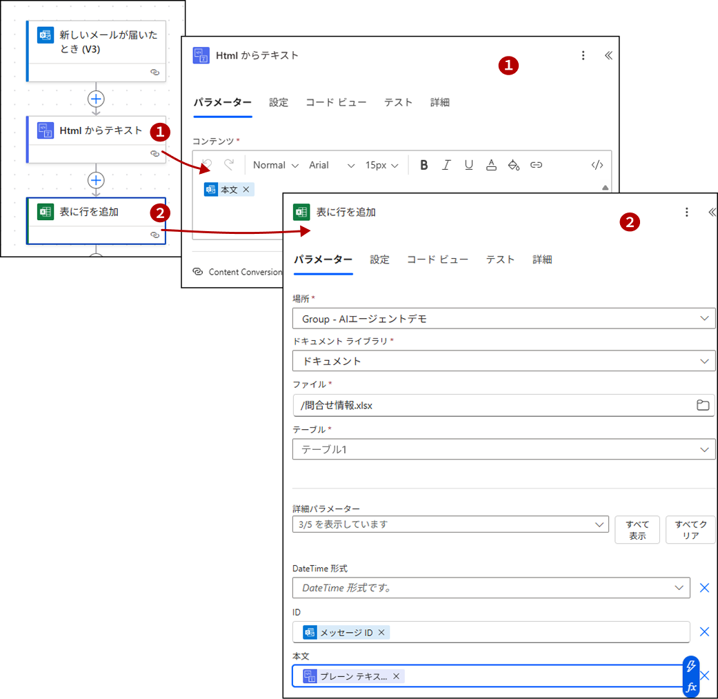 - Power Automate の [Html からテキスト] アクションで文字列のみ取り出し、取得した情報を Excel の列にセットしていきます。