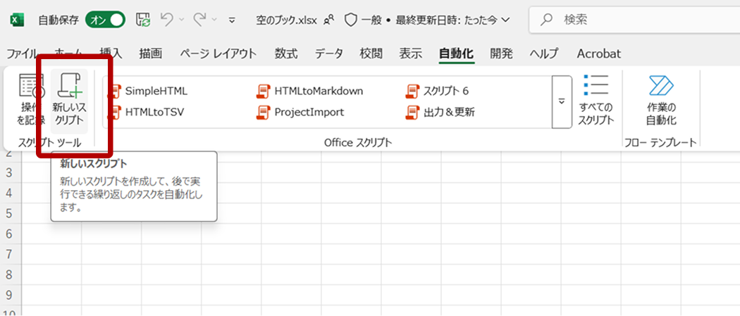 - 作成した空のブックを開き、Office Scripts を新規作成します。