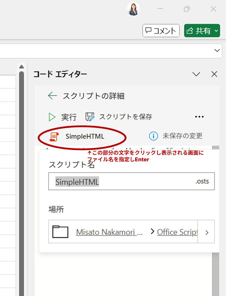 function main(workbook: ExcelScript.Workbook, rawHtml: string) { // 画像タグを消す rawHtml = rawHtml.replace(/<img\b[^>]*>/gi, ""); // そのまま返す return { cleanHtml: rawHtml.trim() }; } - スクリプトに名前を付けて保存します。