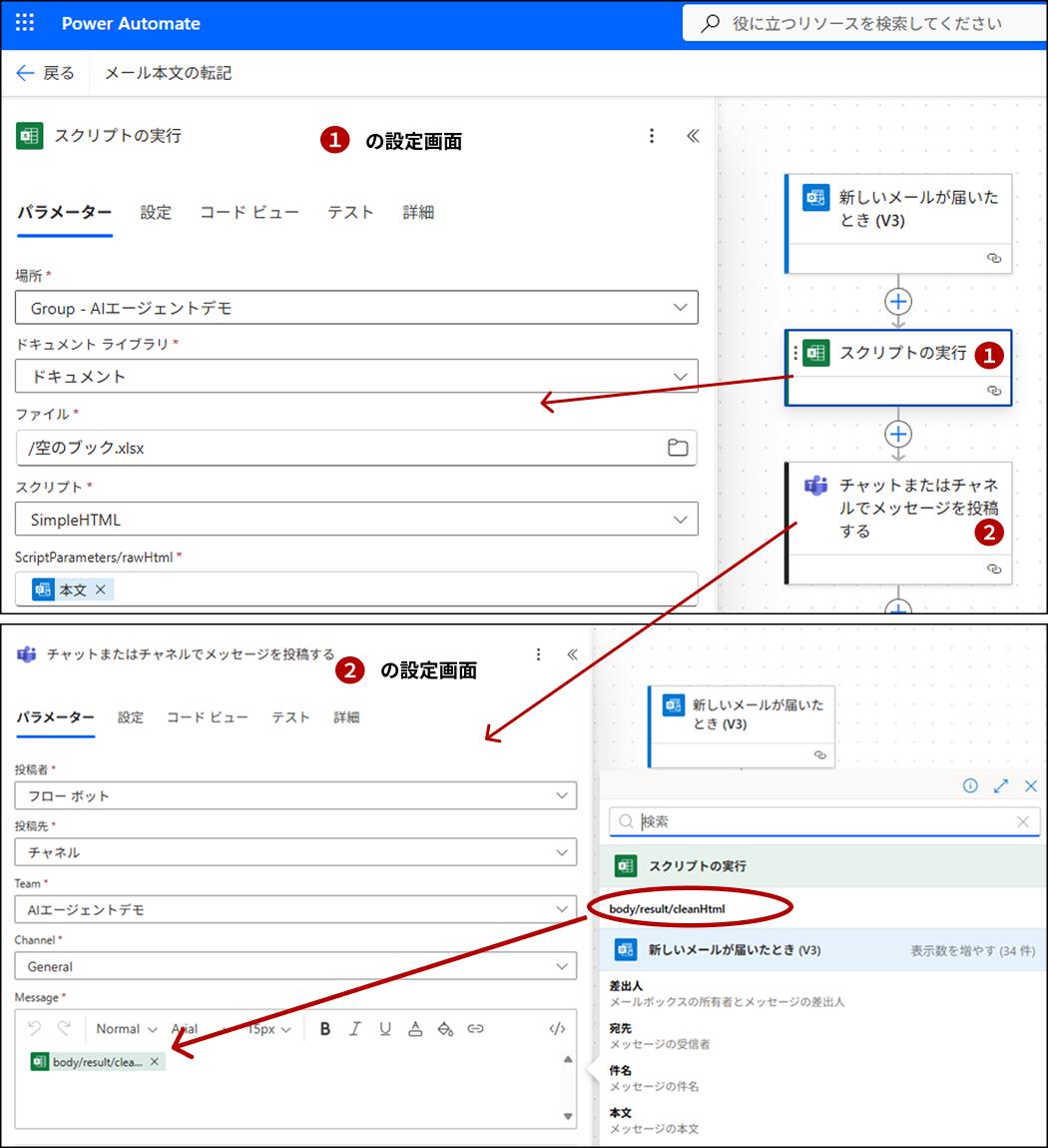 - [スクリプトの実行 (Excel Online (Business)] アクションと [チャットまたはチャネルでメッセージを投稿する (Microsoft Teams)] を追加し以下の様に設定します。