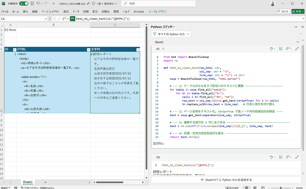 また、最近注目されている Python in Excel を活用することで、HTML からのテキスト抽出や整形をさらに柔軟に処理することも可能です。