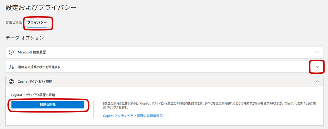 - [プライバシー] タブを開き、[Copilot アクティビティ履歴] セクションを展開すると表示される [履歴の削除] ボタンをクリックします。
