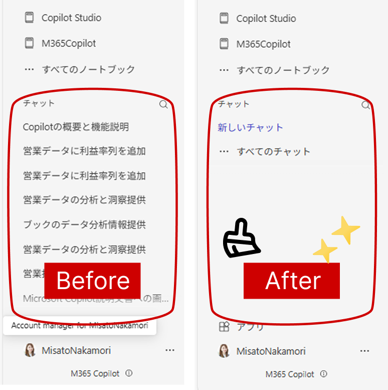 一方で、以下のような場合には、Copilot Chat のチャット履歴一括削除が有効です。